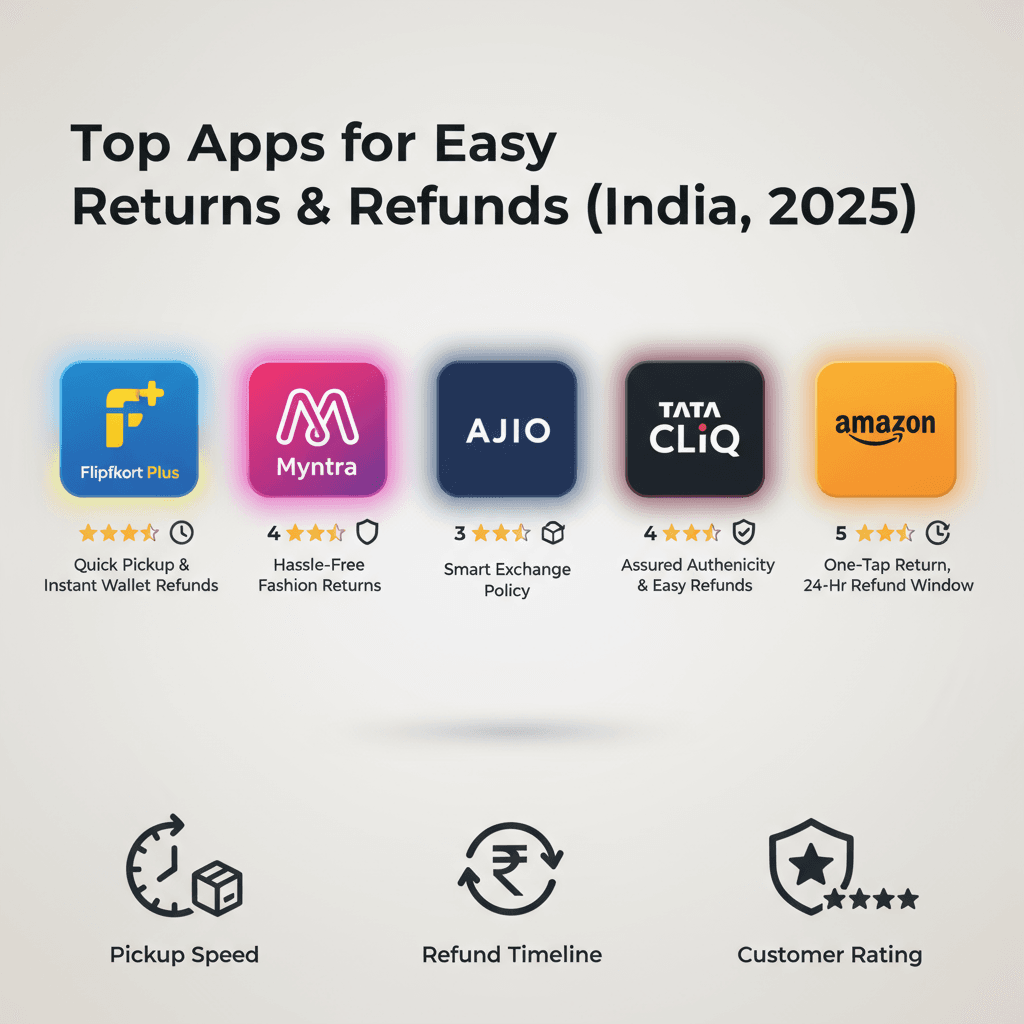 Flipkart Plus | 30 days | Doorstep pickup | Instant refunds, AI-assisted tracking | Recognized as one of the shopping apps with best return policy for reliability |
