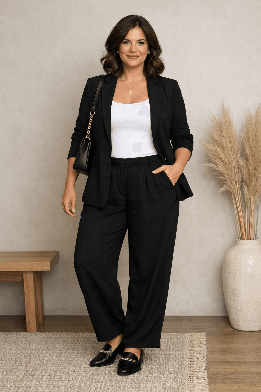 Black or navy trousers paired with a soft white, beige, or pastel top.