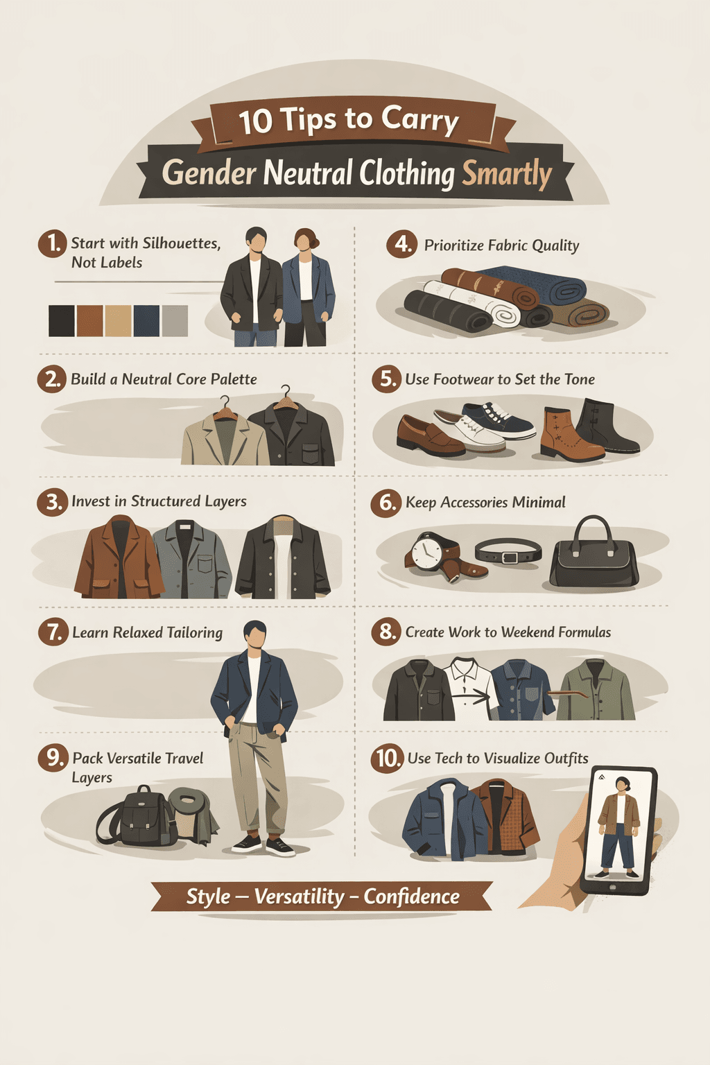 Carrying gender neutral clothing smartly is about choosing versatile silhouettes, neutral colors, quality fabrics, and layered pieces that work across work, weekends, and travel. Focus on relaxed tailoring, intentional accessories, and adaptable footwear rather than gendered labels.